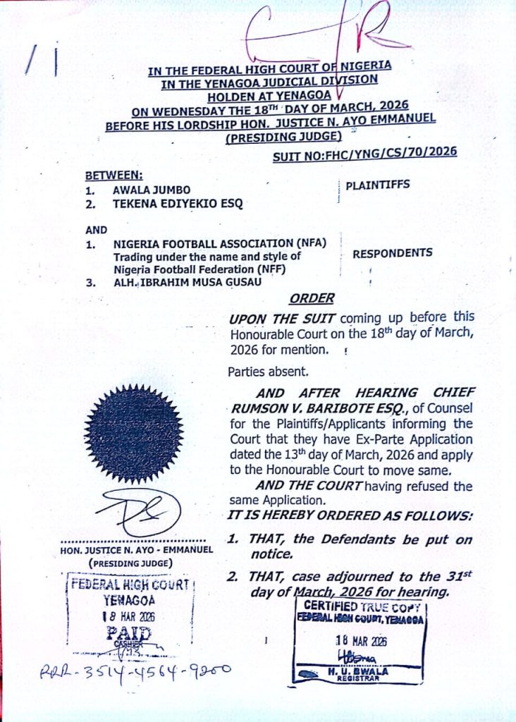 According to The Punch, The plaintiffs in the suit marked FHC/YNG/CS/70/2026 are a former Super Eagles player, Awala Jumbo, and a legal practitioner, Tekena Ediyekio.